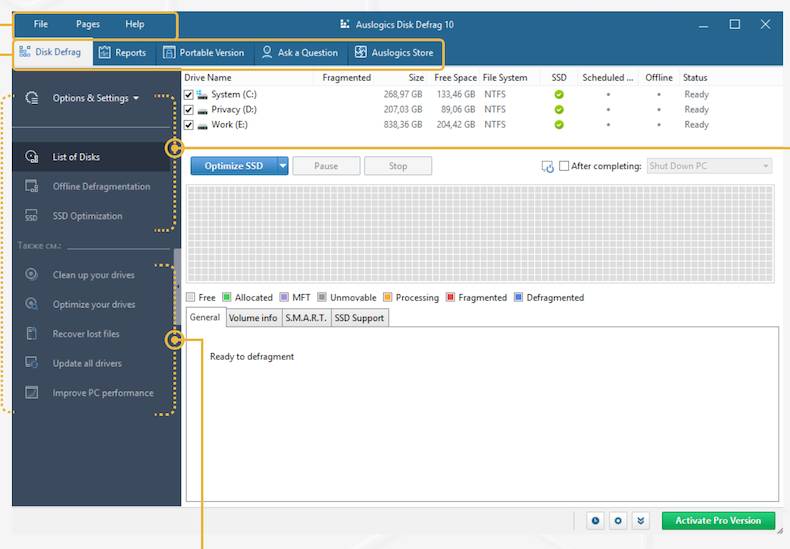 Auslogics Disk Defrag - это приложение, которое можно легко использовать благодаря удобному интерфейсу и которое работает заметно быстрее, чем дефрагментатор диска в Windows, поддерживает все текущие версии Windows, такие как Windows 10, 7, Vista и XP.