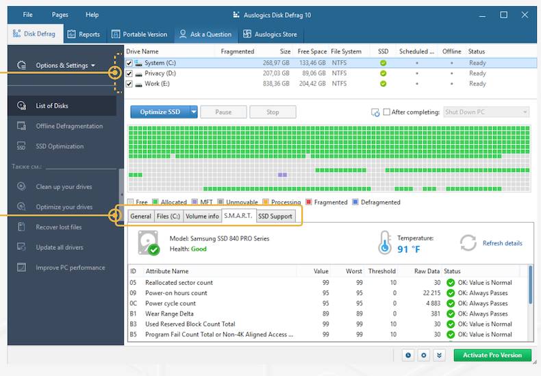 В обновленных версиях алгоритм слияния был улучшен на @ и увеличена скорость обработки. Кроме того, удаление временных файлов и регулировка использования ресурсов (низкий, нормальный, высокий) перед дефрагментацией, выбор «Дефрагментация» для простой и быстрой ежедневной дефрагментации или «Дефрагментация и оптимизация» для выполнения полной дефрагментации диска. Было добавлено много дополнительных функций и новых параметров. в программу, например, назначение операций слияния, освобождение места и обеспечение непрерывности используемых файлов.