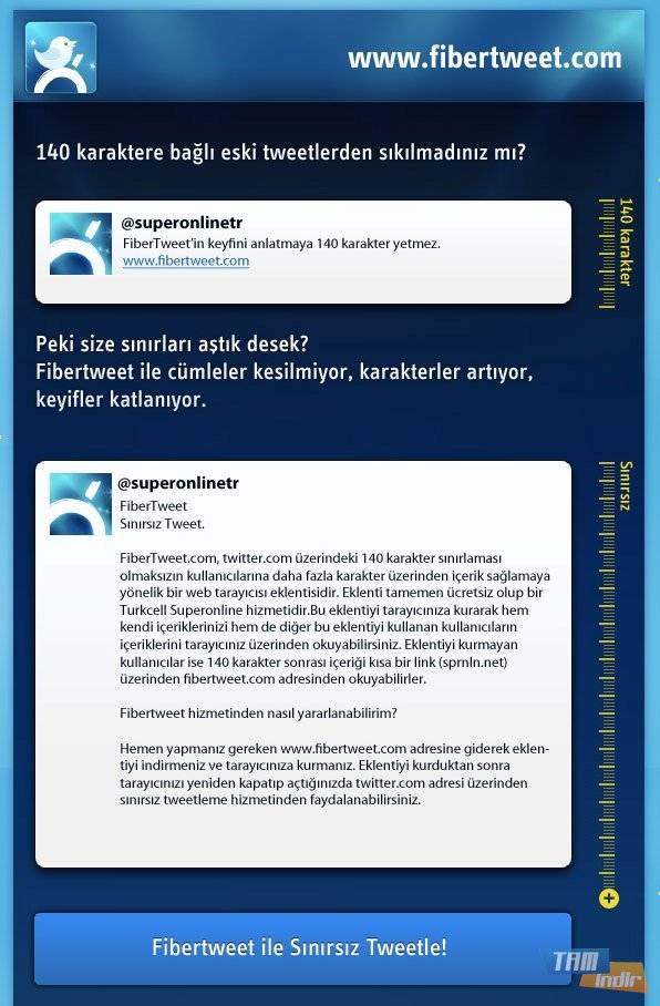 FiberTweet, разработанный для браузеров Google Chrome и Safari, снимает ограничение в 140 символов на сайте Twitter. Когда вы устанавливаете плагин, вы можете видеть неограниченное количество сообщений от других пользователей, использующих плагин. Пользователи, у которых не установлен плагин, могут просмотреть остальные сообщения с помощью сокращенной ссылки. Вы можете бесплатно попробовать плагин, подготовленный Turkcell Superonline, чтобы воспроизводить звук в социальных сетях.
