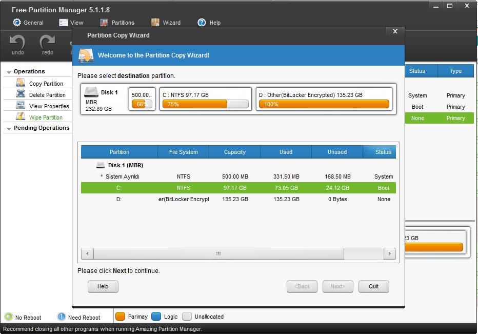 Free Partition Manager, представляющий собой мощный инструмент, с помощью которого вы можете разбивать жесткие диски на своих компьютерах и управлять ими, упрощает важные операции благодаря своим функциональным возможностям. Вы можете логически разделять, удалять и переставлять диски с помощью программы, которая служит универсальной программой. Вы также можете получить доступ к файлам, которые вы удалили ранее, с помощью приложения. Вы можете найти файлы, которые вы случайно удалили, с помощью приложения, которое быстро сканирует диск. Free Partition Manager приходит к вам на помощь с функциями передачи данных, изменения размера разделов, копирования, слияния, очистки, аудита и скрытия. Ваши компьютеры дышат приложением, которое также увеличивает производительность SSD и HDD.