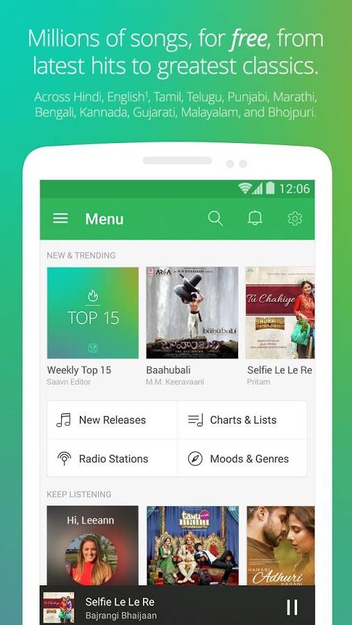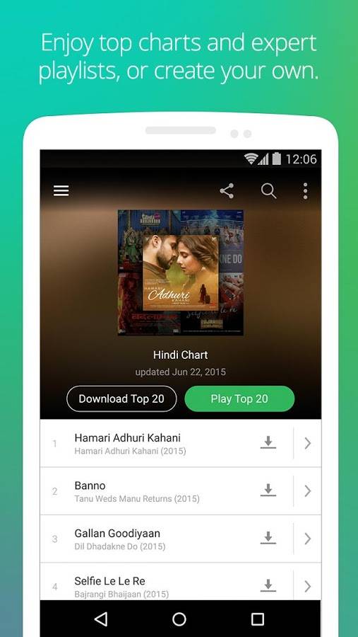 Saavn предлагает широкий каталог труднодоступной классики для часто слушаемых популярных песен. Вы можете добавить песни, которые хотите, в список воспроизведения и наслаждаться неограниченным количеством музыки. Если вам интересна индийская музыка, но вы не знаете, какой трек слушать, можно просмотреть специальные списки и мгновенно найти треки, соответствующие вашему настроению или жанру.