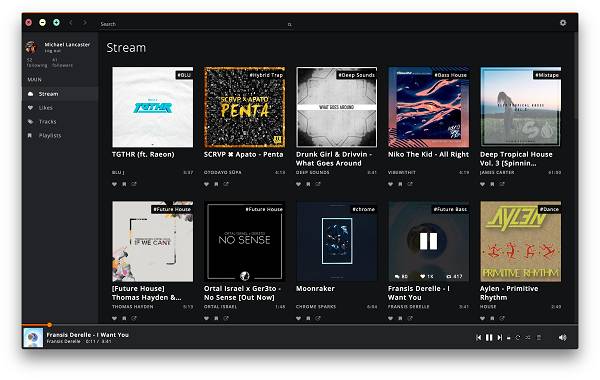 Интерфейс программы, позволяющий полностью и качественно слушать все треки на SoundCloud, также довольно прост. Информация вашего профиля находится на левой панели, и вы можете получить доступ к своим плейлистам и всем песням одним щелчком мыши. На главном экране треки перечислены с обложками альбомов.